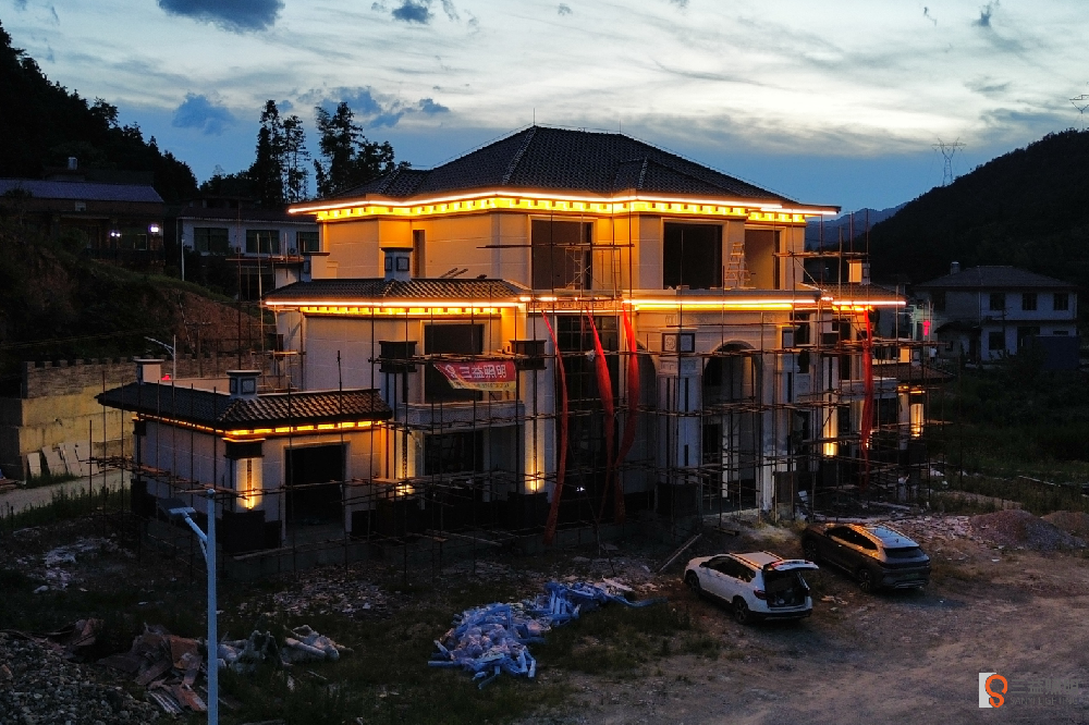 大福劉府是三層新中式別墅,外墻使用藝術仿石漆,搭配暖白色燈光,效果溫馨又豪氣。